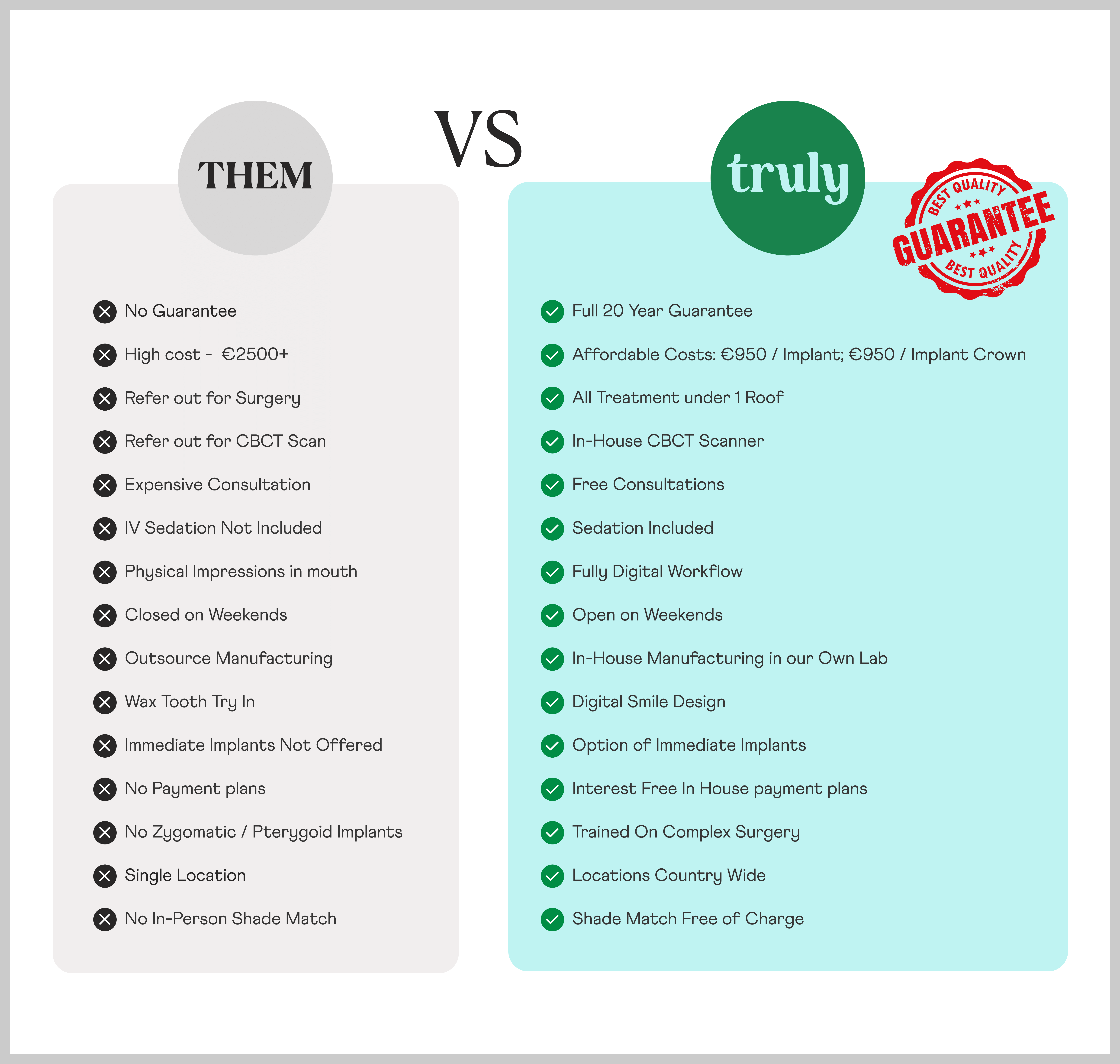 We are proud to be the only clinic in Ireland to offer a full 20-year warranty on the majority of Implant placements, so if you are experiencing any issues with your tooth before that time we will be happy to assess and restore it without any additional charge while it is under warranty. You can trust us to provide you with superior, long-lasting treatment that is both cost-effective and delivered to the highest possible standard.